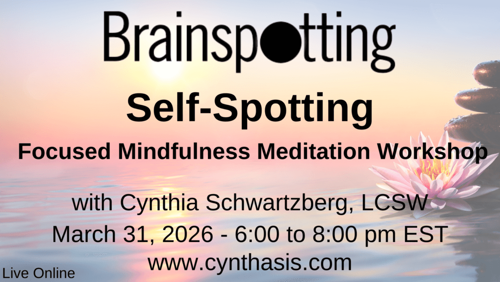 Welcome to the Self-Spotting Workshop, based on the Brainspotting process called focused mindfulness. It is ideal for those wanting to expand their meditation practice or try focused mindfulness. Self-Spotting is ideal for anyone seeking peace and balance during challenging times.